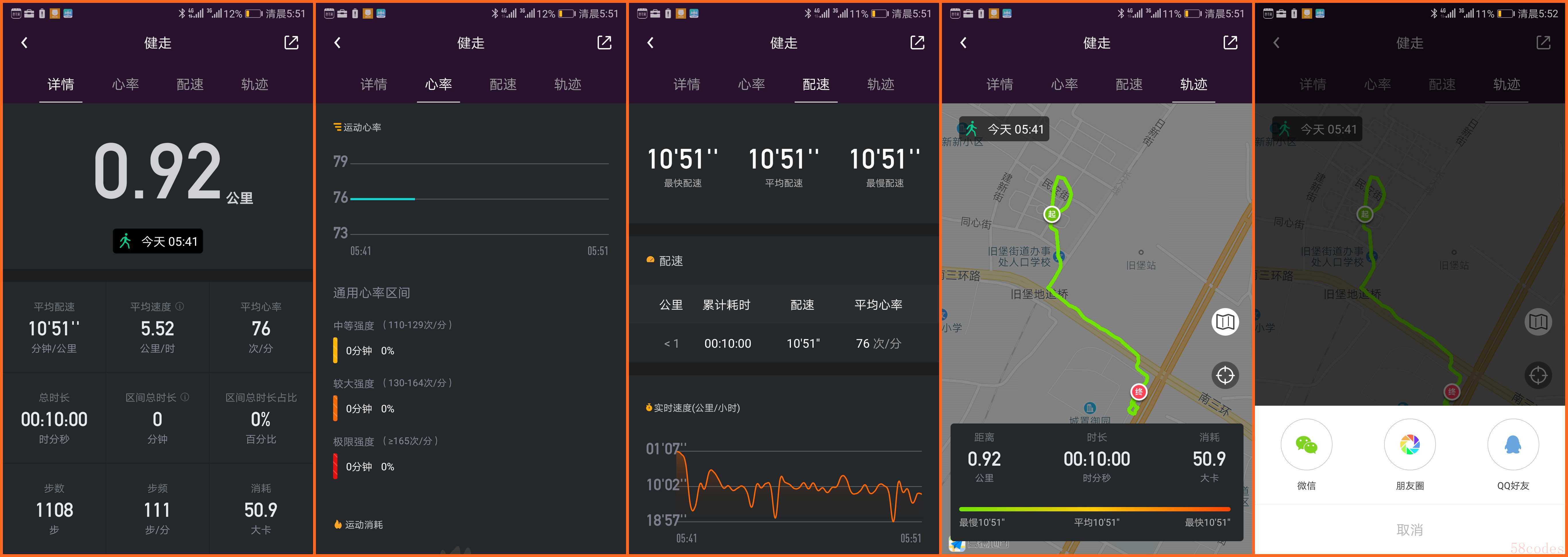 选择好健走模式。在健走时,手环可以实时显示详情、心率、配速和轨迹。各项数据也可以微信、朋友圈、QQ好友。参考各项数据调整自己健走运动量。从轨迹上看GPS定位准确。