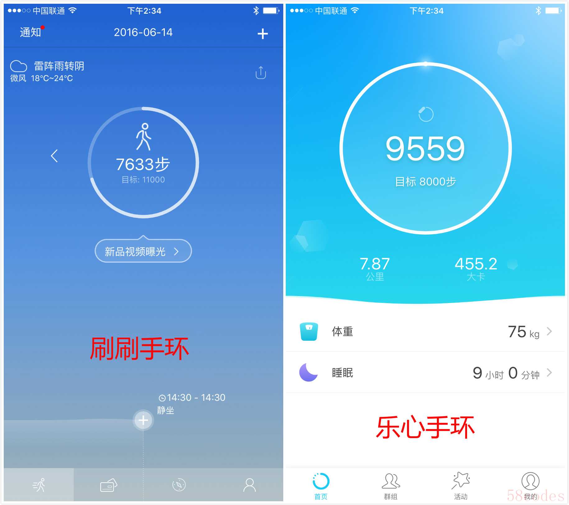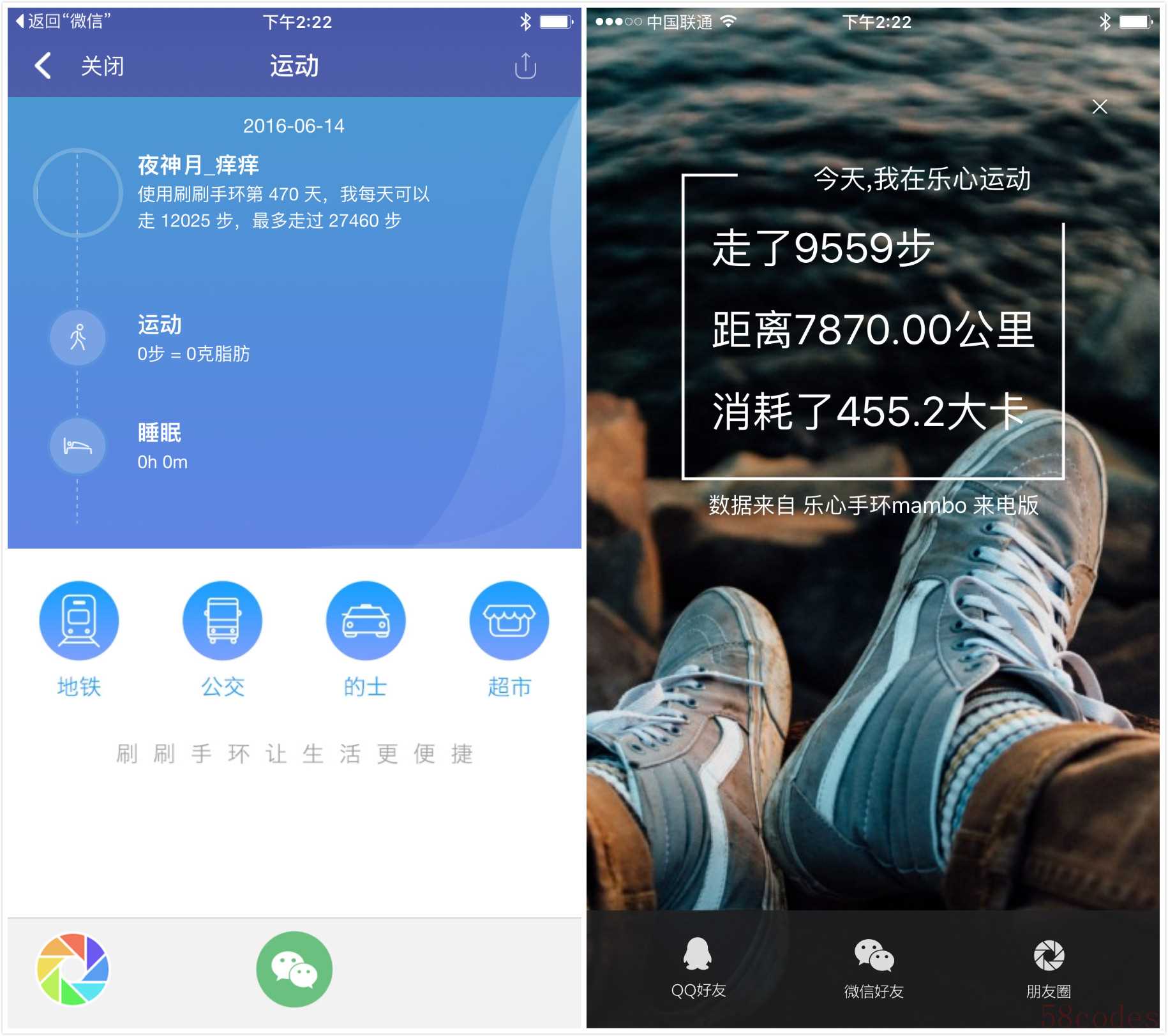 简单举个例子,左侧是刷刷手环的分享,右侧是乐心手环的分享,左侧相对而言有些呆板,没有右侧感觉有活力;左侧分享的数据(运动与睡眠)并没有与手环实际同步的相符,右侧则是实时运动数据的分享。下图分别是两个手环的实时运动数据。