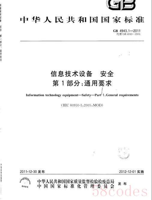 GB4943.1-2011(信息技术设备-安全-第1部分:通用要求)于2011年12月30日发布,并将在2012年12月1日取代前一版标准GB 4943-2001。GB4943.1-2011是中国强制性认证标准,对于在CCC目录范围内的信息技术产品必须要取得的CCC认证后才可以在中国市场销售。