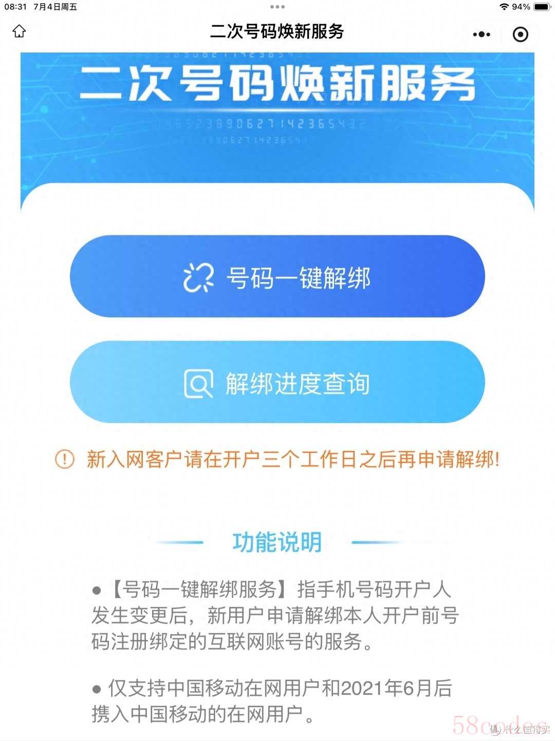 移动用户:打开 “中国移动 APP”→ 直接在首页搜 “解绑服务”→ 进 “二次号码焕新” 页面。
