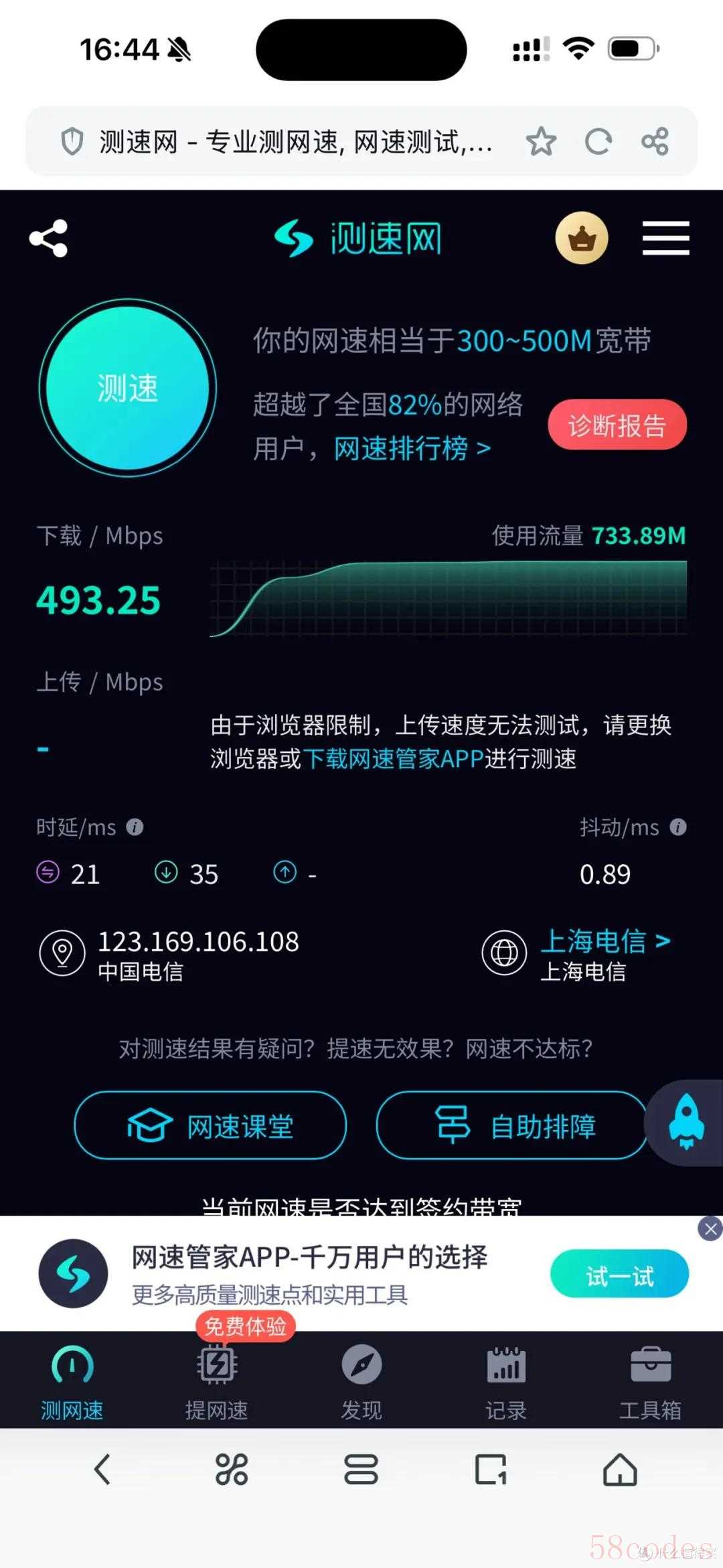 之后是测网速,一般来说,附近有 5G基站,手机是5G手机再配 5G套餐,那下载速度在 500Mbps 以上就没问题,要是网速在 300Mbps多数场景都够用了。这是 4G 卡的最快速度了,但想要更快的网速,还得升级 5G 资费。
