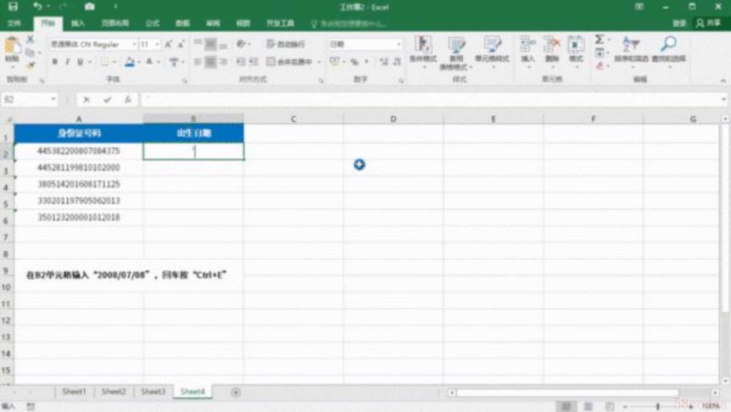 在身份证中,出生日期是规律性的,也可以使用“Ctrl+E”完成出生日期的提取。