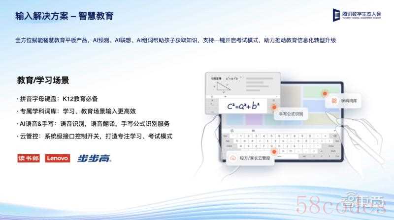 腾讯搜狗输入法划分在校、在外、在家三大场景:在校场景,与航智、领创等智慧校园SaaS服务商合作,开发针对校园场景的定制版云管控输入解决方案;在外场景,与新兴青少年手机品牌合作,参与青少年手机输入法定制;在家场景,与步步高、好未来、联想等教育智能硬件厂商合作,开发针对教育平板的输入法。