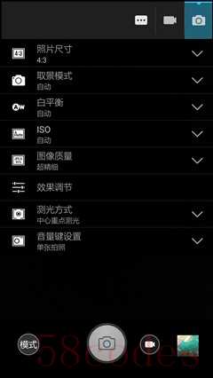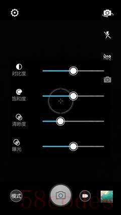 相机界面也相当简洁,可直接在拍照界面控制闪光灯、HDR的开启与关闭,模式中还可选择全景模式及包含9种实时滤镜的特效模式。此外,相机的设置界面可以根据拍照的需求对白平衡、ISO、对比度、饱和度以及曝光等参数进行手动设置。