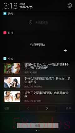 下拉菜单则与原生安卓类似,一次下拉可查看通知及包括Wi-Fi、数据、GPS、屏幕亮度等在内的一部分快捷设置,再次下拉可查看所有快捷设置按钮。向左滑动可查看天气、备忘及新闻瀑布流。