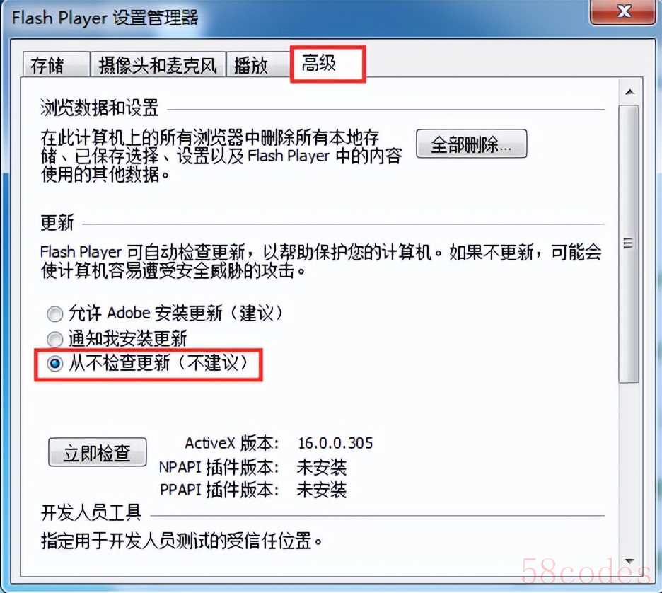 3、在flash player设置界面中,点击“高级”选项卡,在下方点选“从不检查更新”,如图所示: