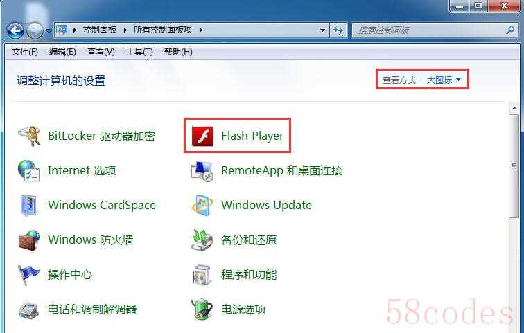 2、查看方式切换成“大图标”,此时列表中就可以找到flash player了,双击打开,如图所示:
