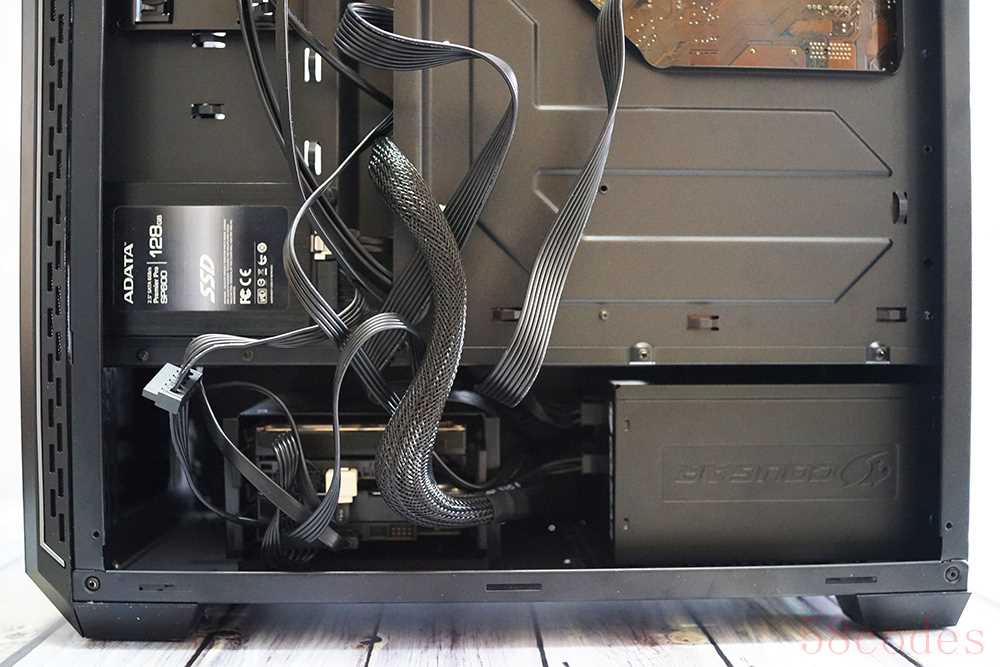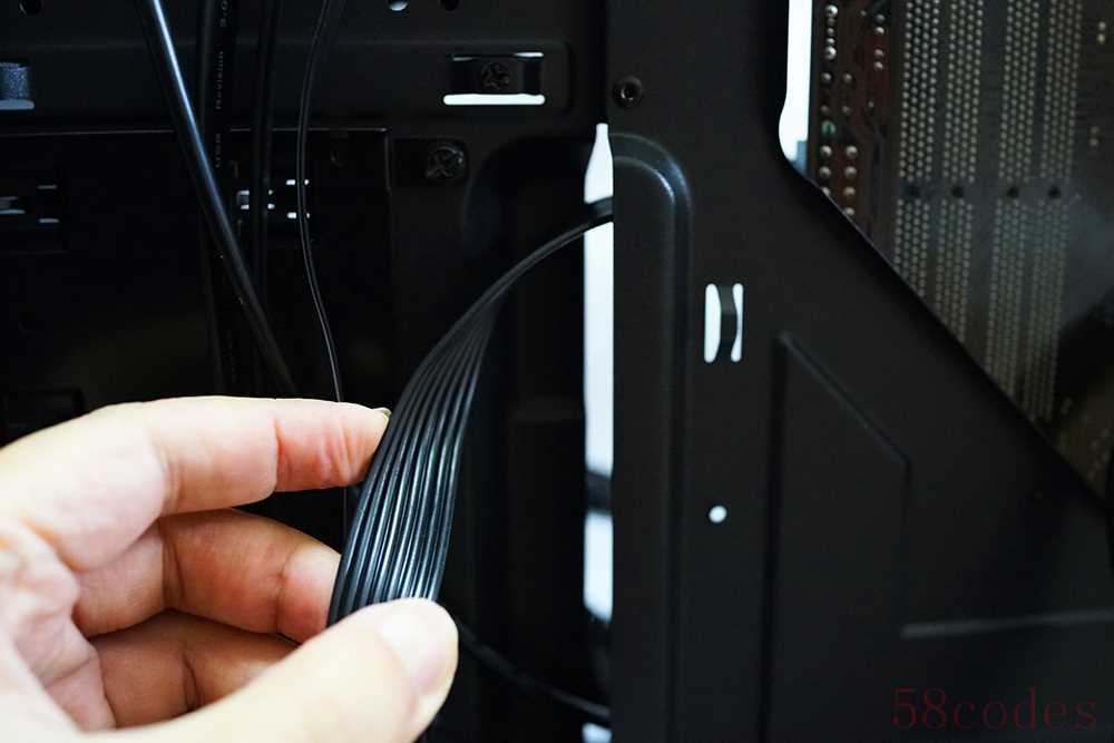 接下来就是分别往主板、硬盘、显卡和散热器上插上对应的模组线,扁平的线缆在机箱的孔位中穿插非常轻松。