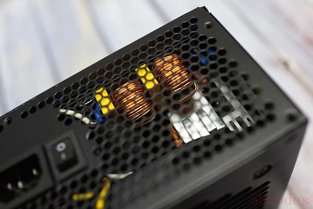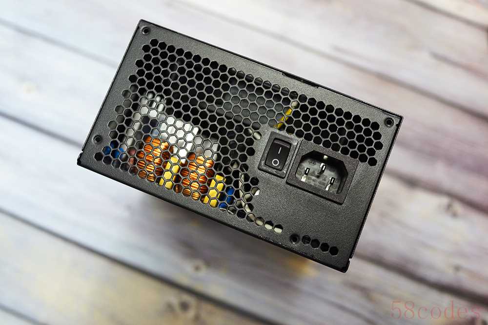 在电源的背面留有大量的蜂巢孔,以利于空气的进入,上面还能看到独立的电源开关。