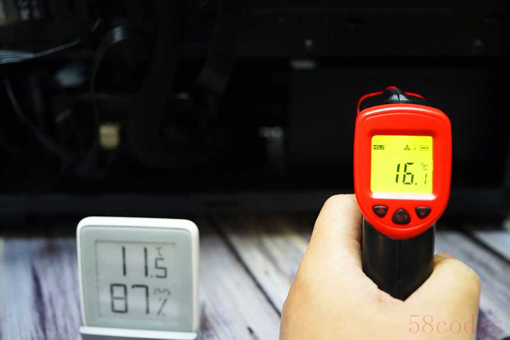 经过一段时间的使用,整台电脑运行非常稳定,既然满负荷也无法达到电源的峰值,那么强压其负载能力也意义不大,所以我重点测试它的散热和噪音情况。在环境温度为11.5℃的情况下,测试电源的表面温度仅仅16℃,仅仅高出5度左右,这也得益于它在散热方面的优良设计。
