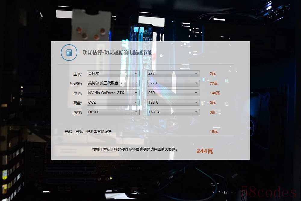 下面就可以开机进行测试了。插上电源线,打开开关,主机顺利点亮。我电脑的配置如下:CPU是i7 3770,主板华硕Z77-V,内存16G,显卡GTX960(4G),硬盘3块,1块SSD,2块机械硬盘。用鲁大师大致算了下功率,但是硬盘只算了一块SSD,还有两块机械硬盘没有算在内,其实机械硬盘也算是用电大户,虽然运行起来只需要10W左右的功率,但是在启动时瞬时功率一般能够达到30W左右,所以如果按峰值计算的话,这台电脑需要的额定功率大约为300W,用骨伽GEX 650W电源来带是绰绰有余。