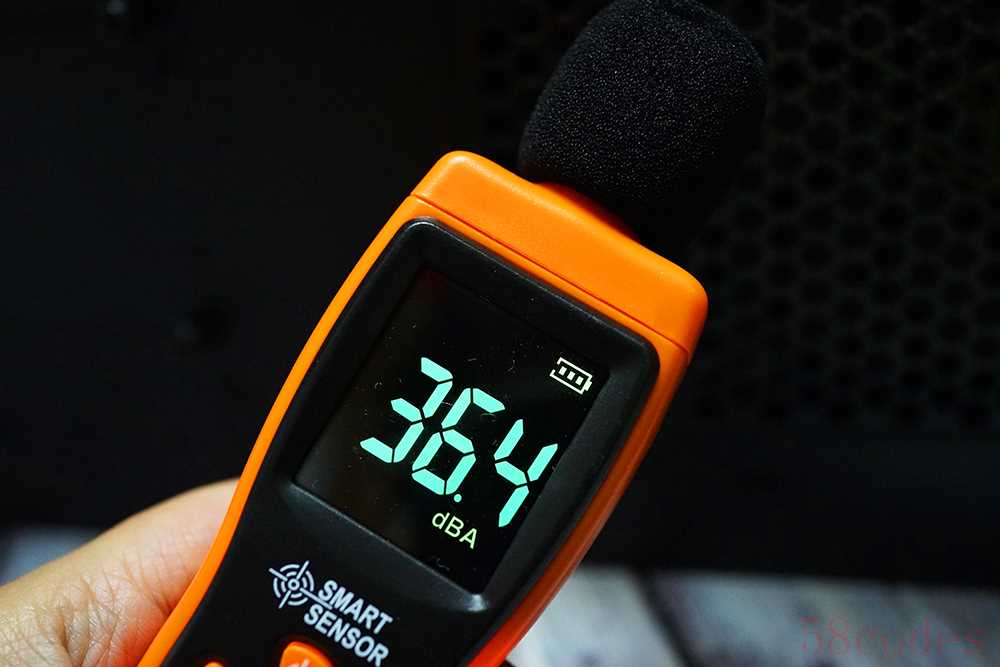 由于电源具备智能温控功能,所以在负荷不大的时候,风扇会停止工作,这时它是没有任何声响的。即使是在转动中,由于风扇直径大,所以转速也不会太高,再加上风扇采用的是动态液压轴承,声音几乎可以忽略不计,下面是我用噪音仪测出的数值,仅仅36dB。