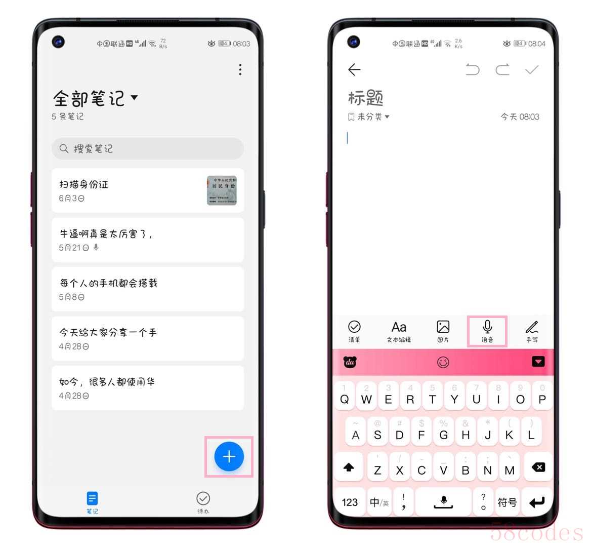 首先我们打开华为手机中备忘录功能,点击右下方的蓝色【+】按钮,创建一个新的笔记,调出键盘,在上方会有一个【语音】功能,点击使用。