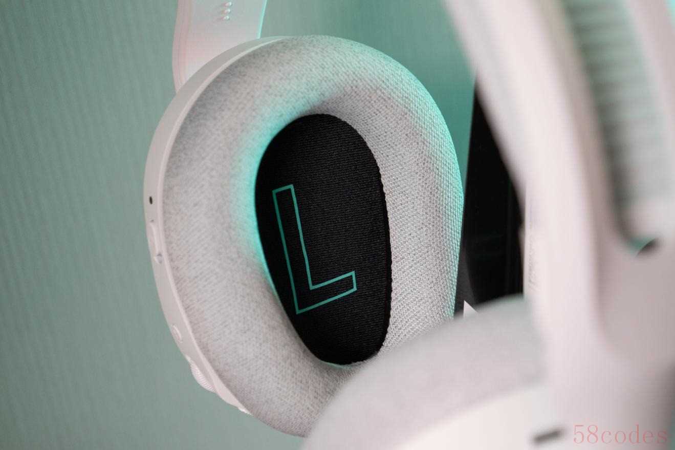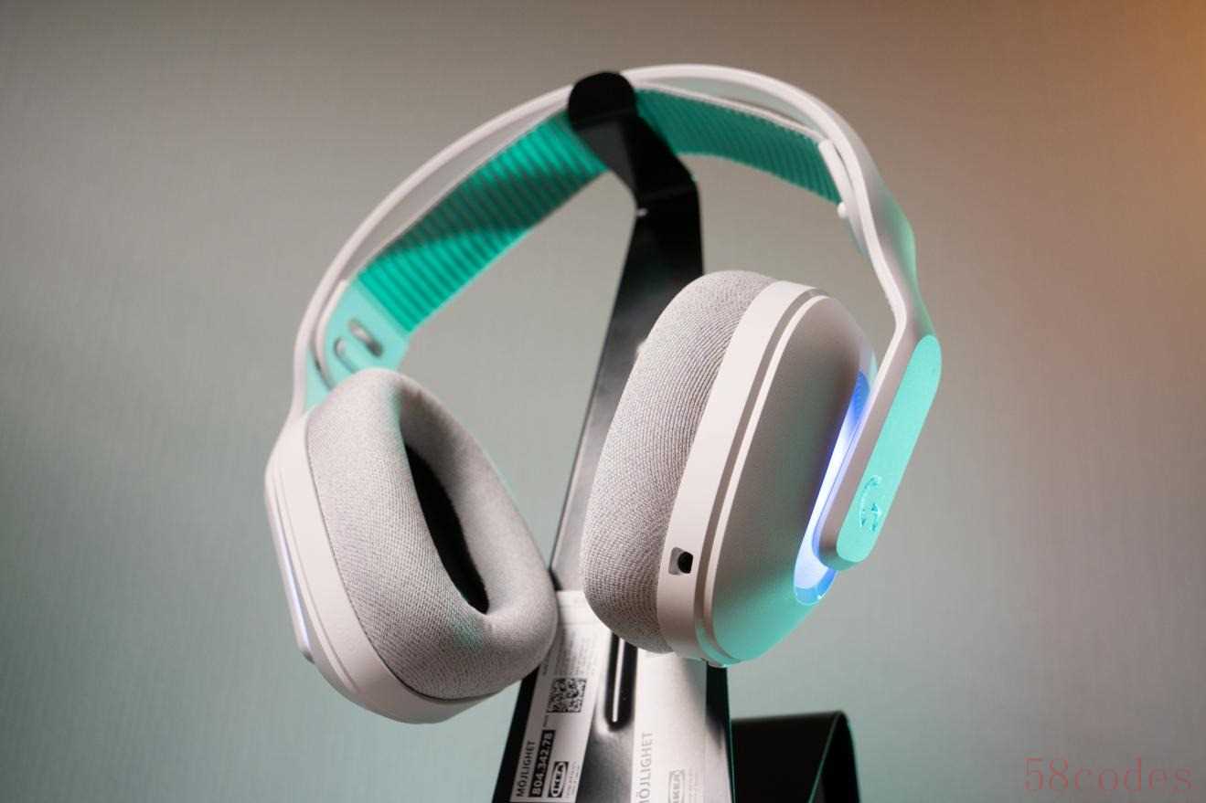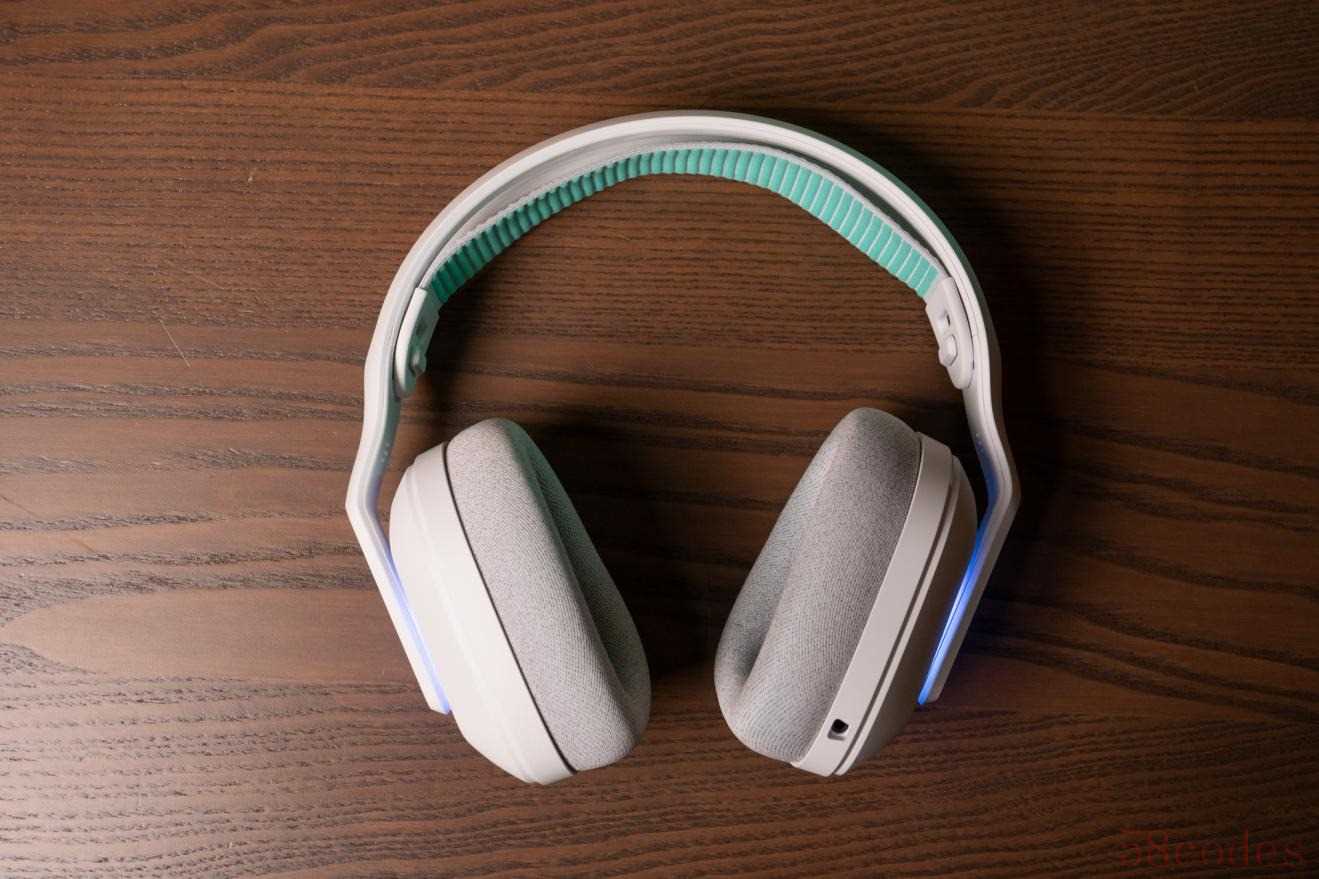 最后我们来聊一聊罗技G522 LIGHTSPEED无线游戏耳机。它采用的是悬浮式头带 + 双支柱设计,我这款白色的悬浮式头带内侧是亮青色,搭配左右两侧有炫彩的 RGB 灯效,作为电竞耳机来说,辨识度相当高。