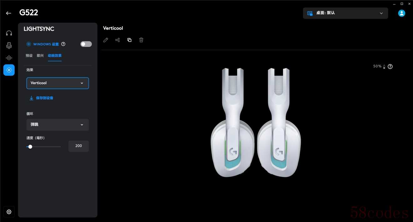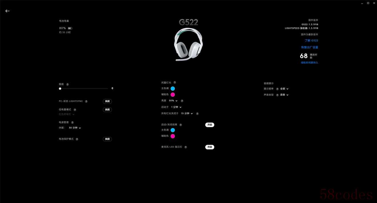 罗技 G HUB 软件依旧是 G522 的“大脑”,从灯光、音效到麦克风,能调的基本都能调,体验非常完整。G522 的耳罩支持多达 8 个独立 RGB 灯区,G HUB 里可以自定义各种模式:像呼吸、波浪、颜色循环这些动态灯效应有尽有,也能自定义静态颜色来配合主机或者键盘的配色风格。如果你还有罗技其他设备,比如键盘鼠标,还能一键同步灯效,整个桌面呼吸感十足。