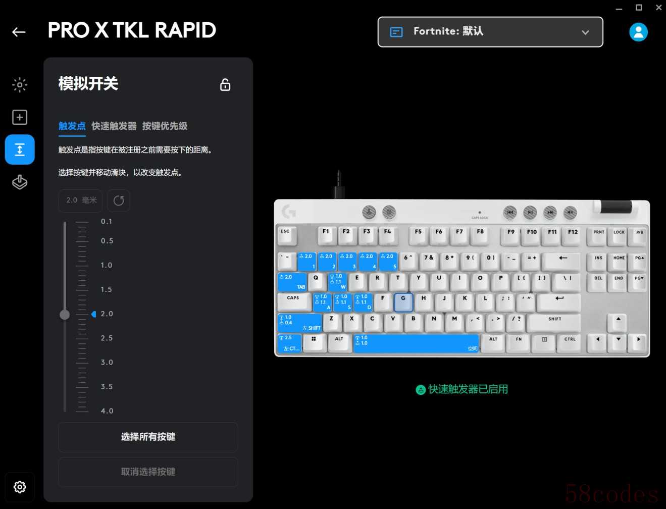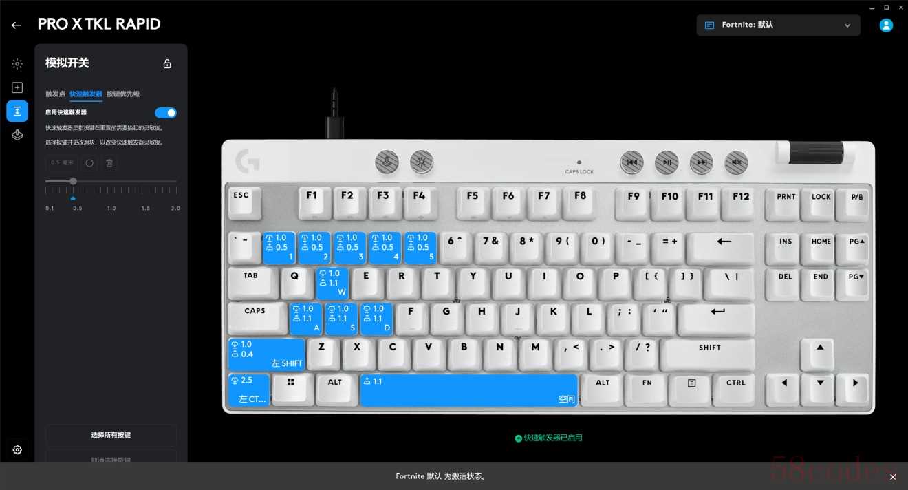 比如我玩《堡垒之夜》的时候,方向键、空格 和 Shift 是我按得最多的两个键。以前打得快的时候总是连跳断了、Shift 偶尔失灵,现在通过G HUB,我可以把这两个键的触发点都调成了 1.0mm,再打开快速触发点,在操作的时候瞬间感觉整个人物的移动都灵活了。轻轻一点就能触发,指头一抬就能重置,按多快都能跟上节奏。建造、跳跃、滑铲、编辑,所有动作的衔接都变顺了,是真的有提升。