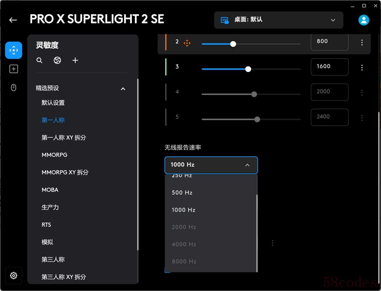 但要注意,想跑到 8000Hz 得单独买一个 8K 接收器,默认包装里的 LIGHTSPEED 接收器最高还是 1000Hz。我目前就是用的默认接收器,回报率 1000Hz,实际用下来已经非常流畅了。