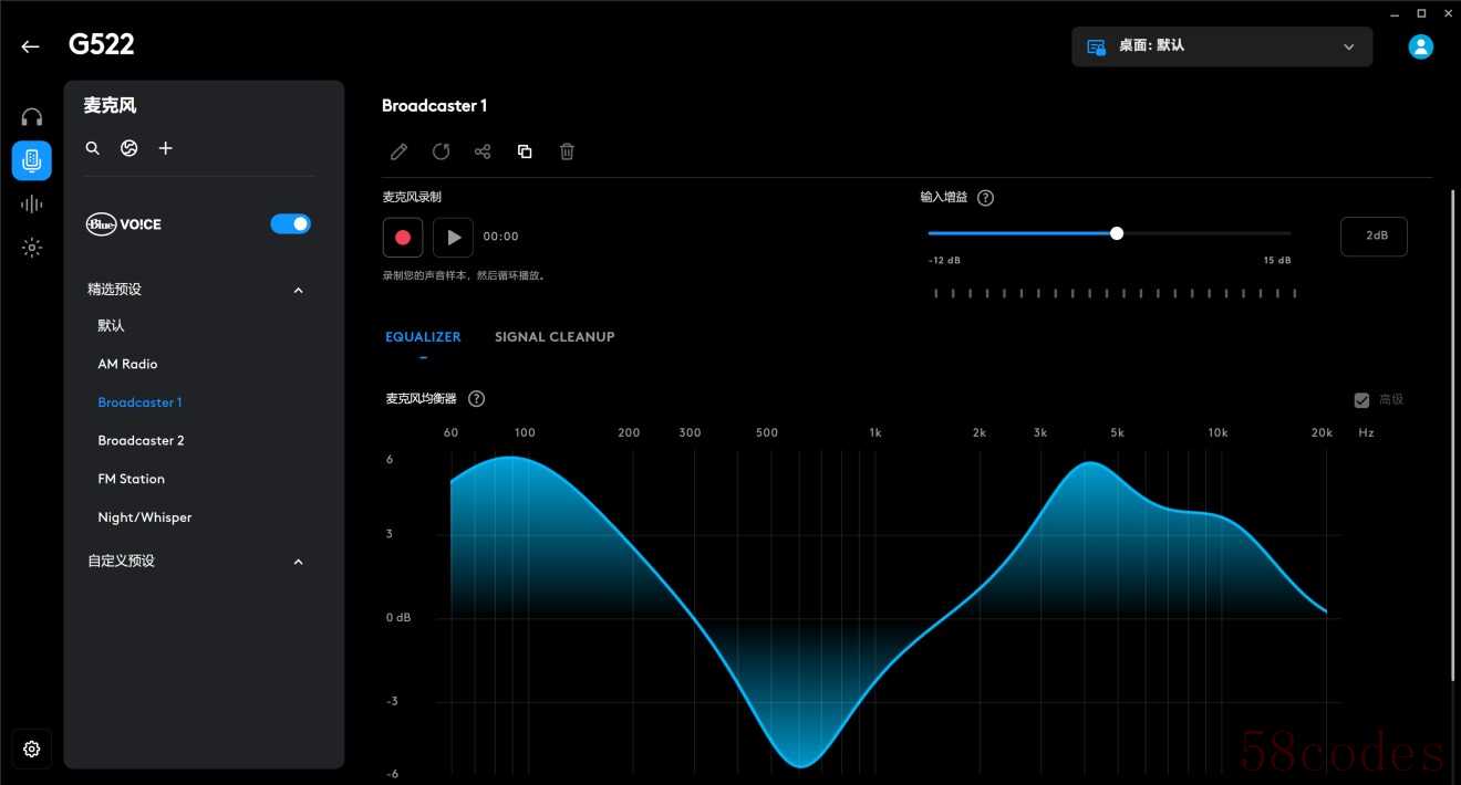 自带的麦克风也是使用 Blue VO!CE 技术认证的降噪麦,在G HUB中可以调节各种麦克风的声音预设,比如我体验的广播级人声预设,可以让声音更低沉富有磁性。还有“低频增强”“降噪增强”等模式,像键盘声、风扇声这些背景噪音都能滤掉不少。