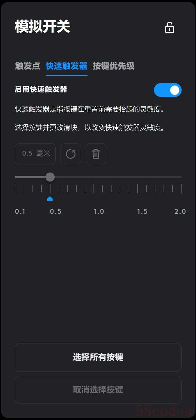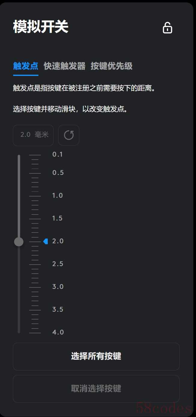 触发点,就是你按下去多深,按键才会被识别为“按下了”。比如你把它设成 1.0mm,那就是按键往下压 1 毫米的时候,信号才发出去;如果你设成 2.5mm,那就得更深才算按下。这个是你自己定的,不像传统机械键盘固定死在一个触底的触发点上。