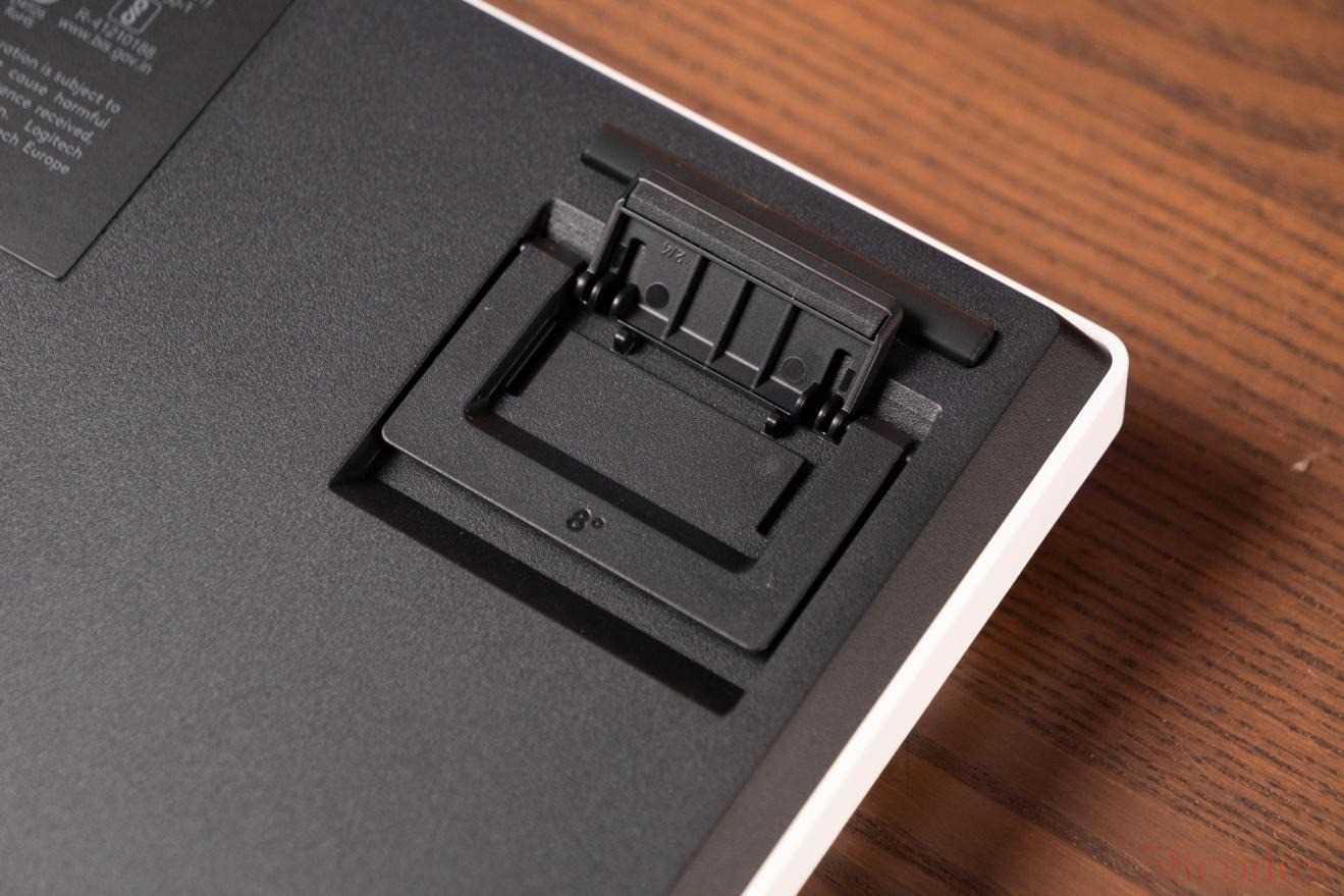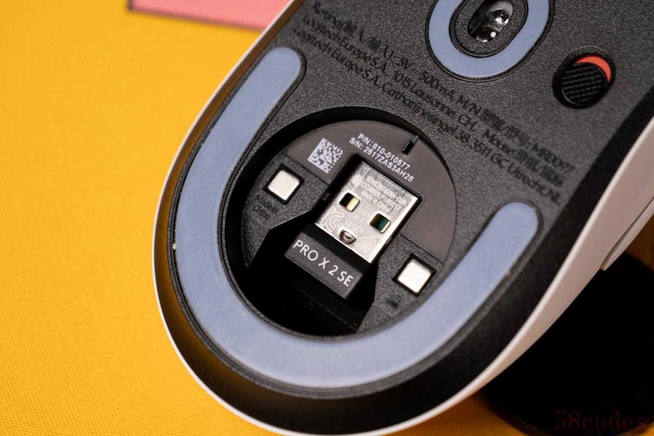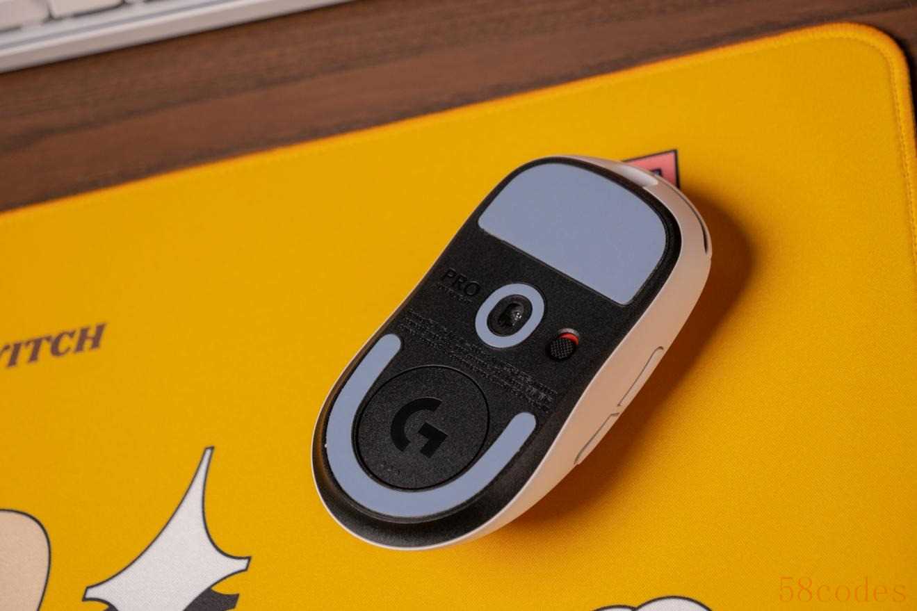 底部的脚垫是大面积的 PTFE(特氟龙)材质,覆盖面积几乎是整个底边框,滑起来非常顺,和我的一代GPW一样,它底部配备了磁吸盖设计的接收器收纳仓,可以把 USB 接收器藏进去。