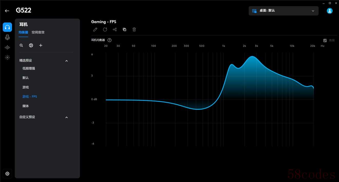 音频方面,G HUB 提供了 EQ 均衡器调节,还内置了不少预设方案,像是 FPS 模式会把脚步声的频段拉高一点,帮助你更精准听敌人;影院模式则增强低频,适合看大片。