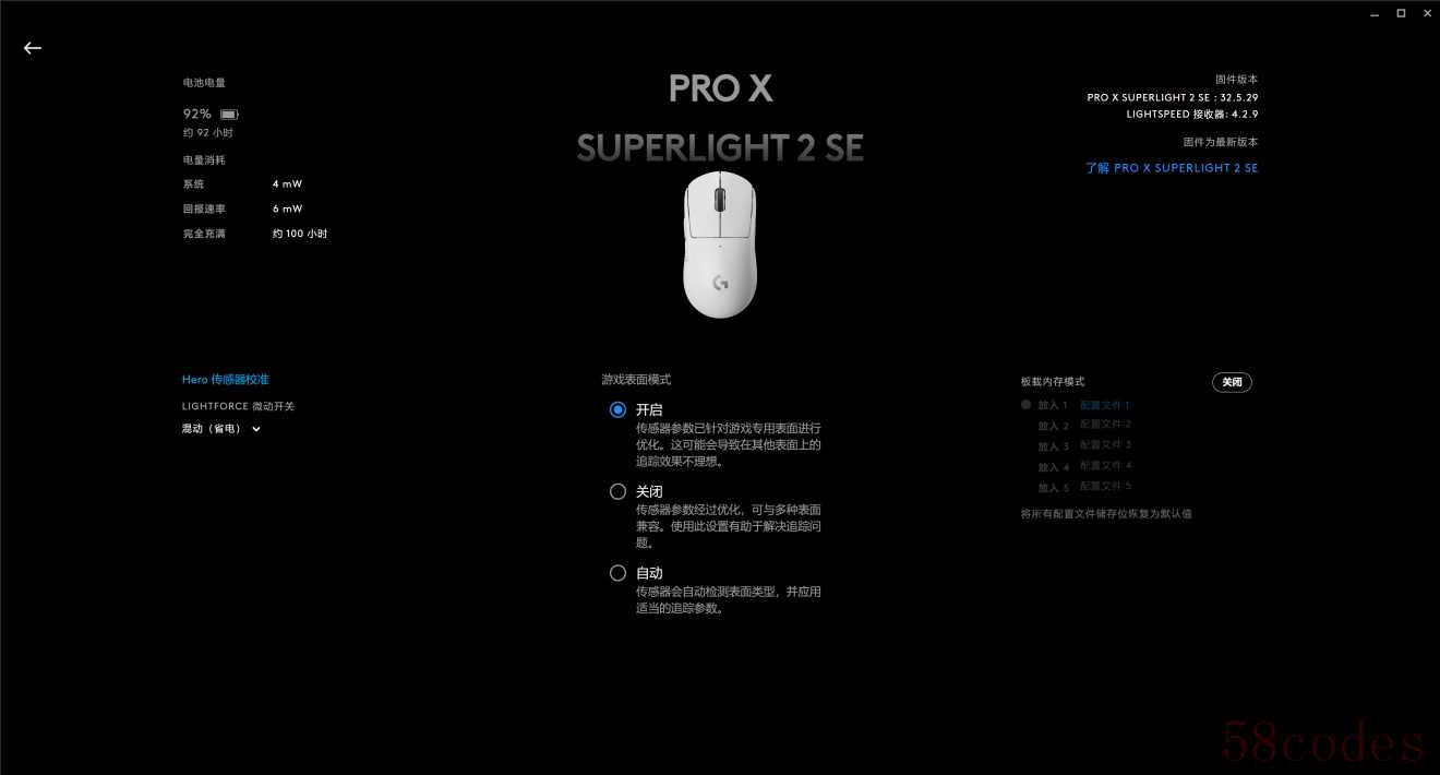 续航方面,鼠标官方页面写的是最长续航大约 88 小时,但我在 G HUB 里翻了一下,它其实还细分了不同模式下的续航表现:如果你把 LIGHTFORCE 微动设置成 混合模式(也就是光学 + 机械,官方建议的省电方案),那续航最高可以到 100 小时左右;如果只用 纯光学模式,大概是 92 小时。