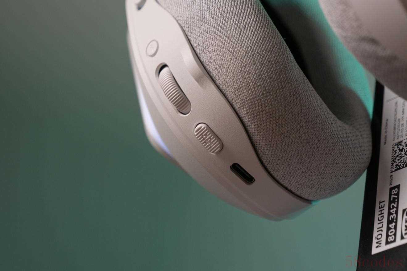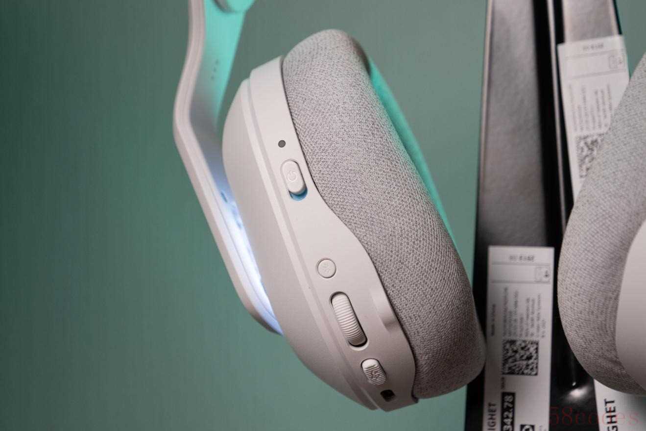 接口方面,左耳罩的后方集中了所有功能:电源键、音量滚轮、麦克风静音、USB-C 接口、蓝牙/LIGHTSPEED模式切换按钮,以及一个可拆卸麦克风口。
