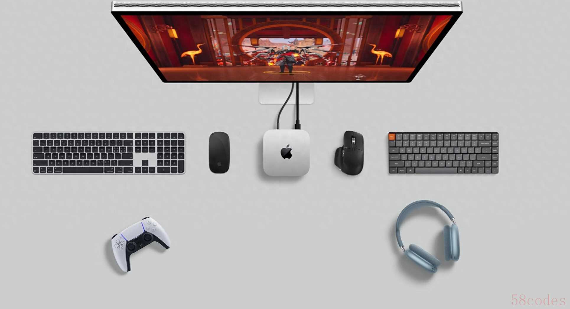 可以看到 Mac mini 配件除了自家妙控键盘外、AirPods Max、妙控鼠标外,就是大家熟悉的罗技 MX Master 3S,和索尼游戏手柄,以及 Keychron 的机械键盘了。