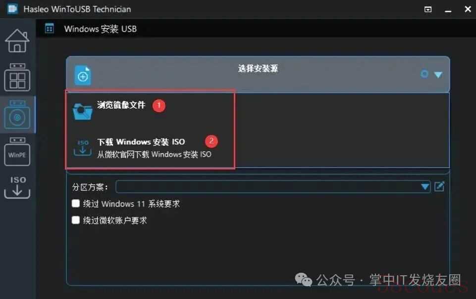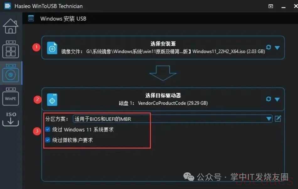 2.插入U盘或移动硬盘,并选择它作为目标设备。3.选择“windows安装USB”,这里你可以选择您准备好的Windows ISO文件,也可以选择下载windows安装ISO,从官网在线下载。