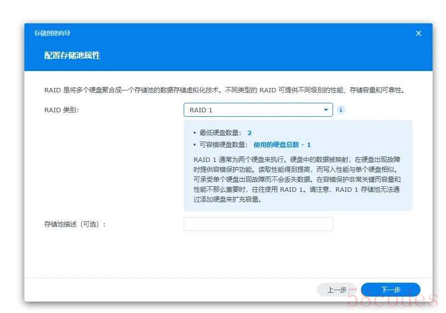 RAID模式选择,如果选择的是SHR,一般新手就可以选择SHR,当NAS里面只有一颗硬盘的时候,磁盘阵列的模式为basic,无数据保护。当再添加为一个硬盘的时候磁盘阵列的模式自动转换成类似raid1模式,空间大小不变,但是多了个数据保护。当再加入一个硬盘的时候会自动转换成类似raid5模式,当然了,你的NAS也要有支持3个盘位。