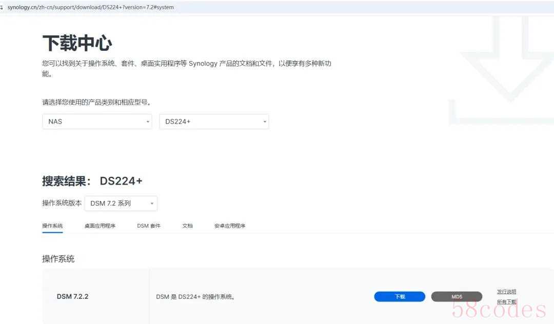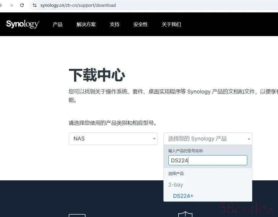 硬盘和NAS设备都正常安装完成之后,下面我们就需要为这个NAS设备安装,群辉的操作系统。那这个设备如何安装操作系统呢?这时我们需要找一台电脑,和NAS设备连接在同一个局域网,然后打开官方网站。选择NAS产品,型号选择DS224+。