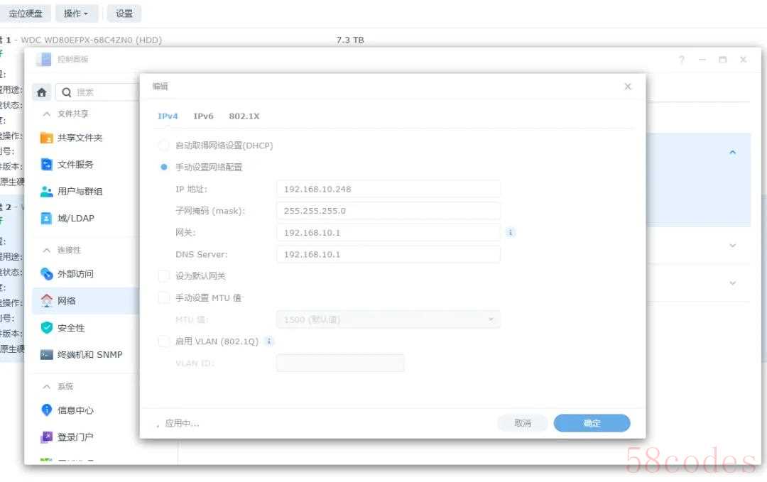 然后我们到NAS设备网络配置中,将NAS的IP地址设置为固定IP地址,192.168.10.248。避免以后有IP地址冲突。