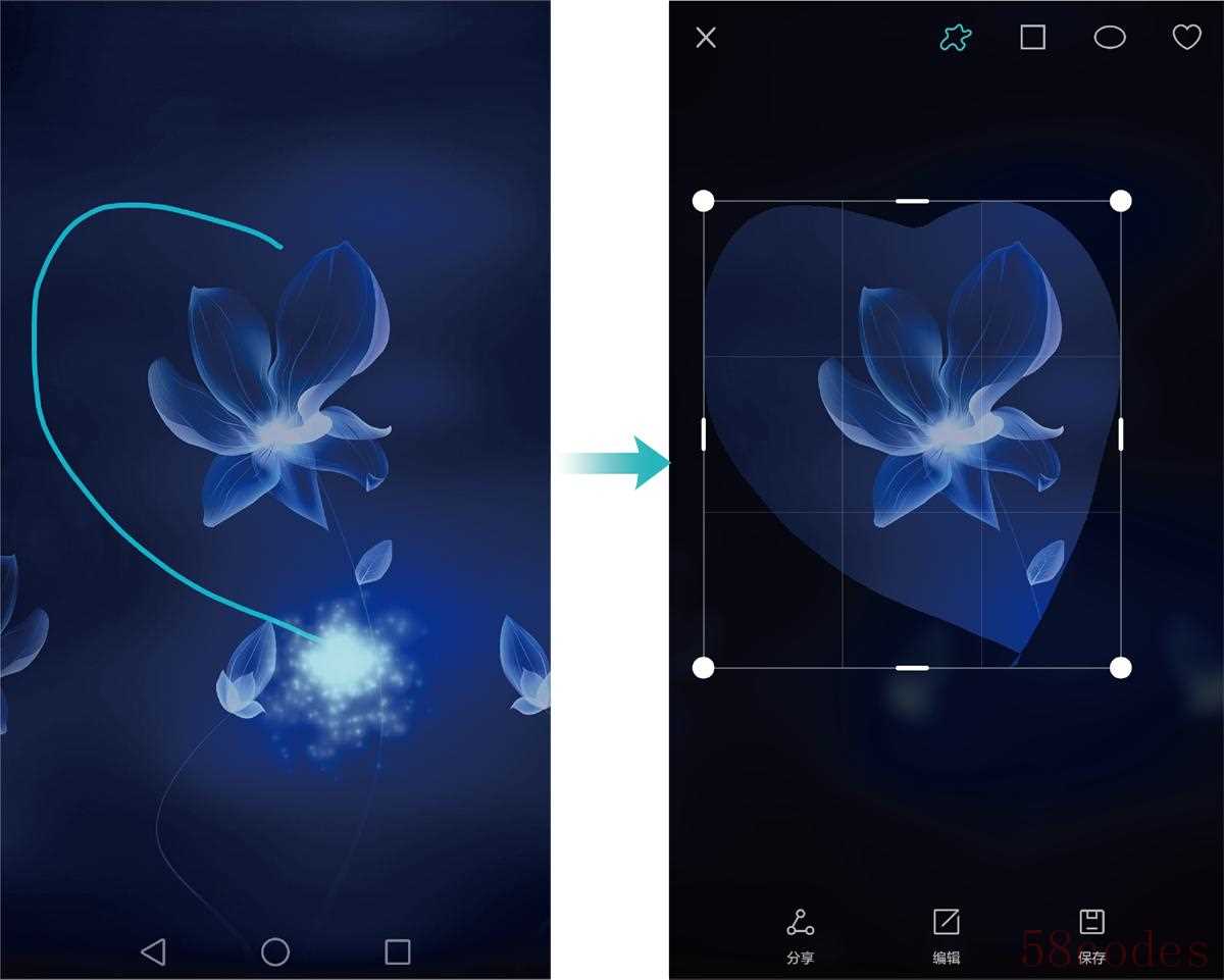 截取特殊形状:使用指关节稍微用力触碰屏幕,确保指关节不离开屏幕,然后拖动指关节沿着所需截取的屏幕区域绘制一个闭合图形,截取闭合图形内的屏幕画面。