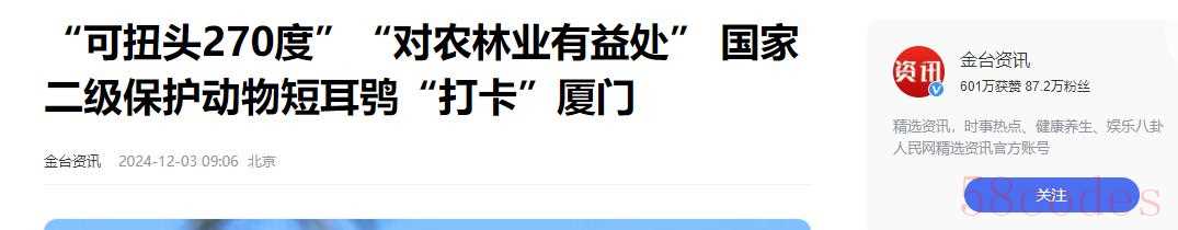 金台资讯2024-12-03发布的《“可扭头270度”“对农林业有益处” 国家二级保护动物短耳鸮“打卡”厦门》