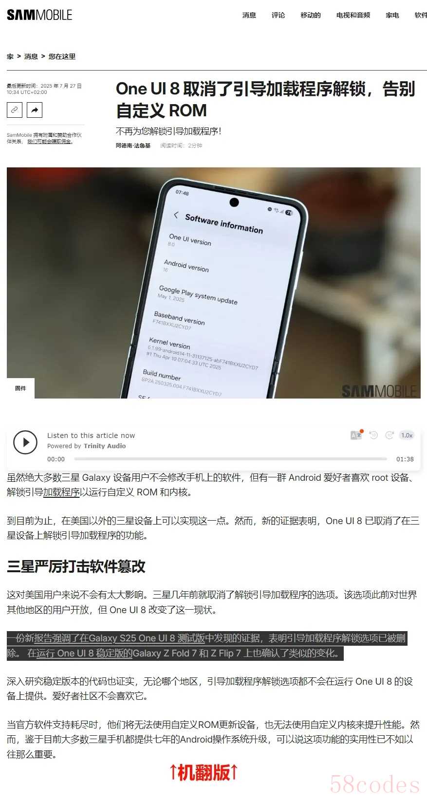 最后补一个“噩耗”,刷机届又一个精神图腾崩塌——三星One UI 8也不让解BL锁了。解锁Bootloader引导程序(俗称解BL锁),是换第三方系统或者root的前置步骤。据Sammyguru报道,三星最新发布的One UI 8系统已经移除了解锁Bootloader的功能(此前,美版三星机型就无法解锁Bootloader,但其他地区的版本可以)。