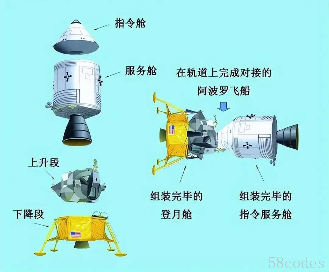 要理解这套返回系统,首先得看清阿波罗登月飞船的整体设计 —— 它并非单一的 “火箭 + 飞船”,而是由 “指令舱(CM)”“服务舱(SM)” 和 “登月舱(LM)” 三部分组成,其中登月舱是实现 “月面起降” 的核心。
