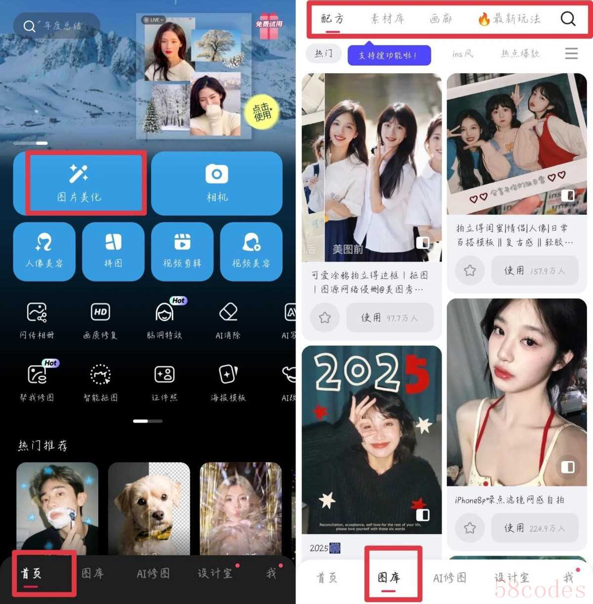 一款备受青睐的P图软件,并且提供多种水印模板可供添加,点击“相机”拍照后选择“美化”或选择“图片美化”导入图片,接着找到并按下“文字”按钮。