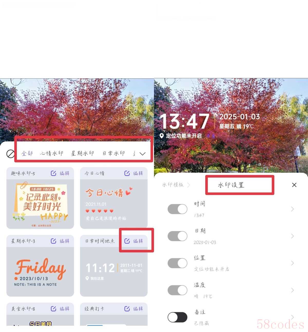 提供的水印模板有进行一定分类并支持自定义编辑,包括时间、日期、心情、天气、备注等元素,水印位置也能自由选择,轻松实现拍照打卡一键搞定。