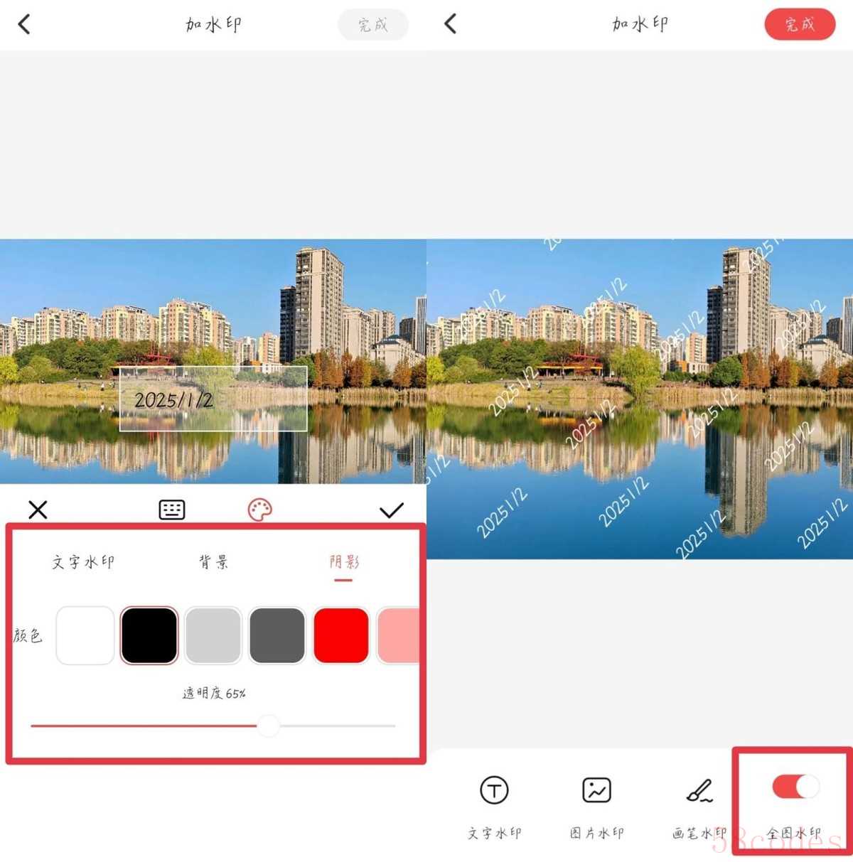 文字水印:可自由调整文字、背景以及阴影的颜色和透明度,水印的位置和大小也支持设置,还可将其铺满整张照片,即全图水印。