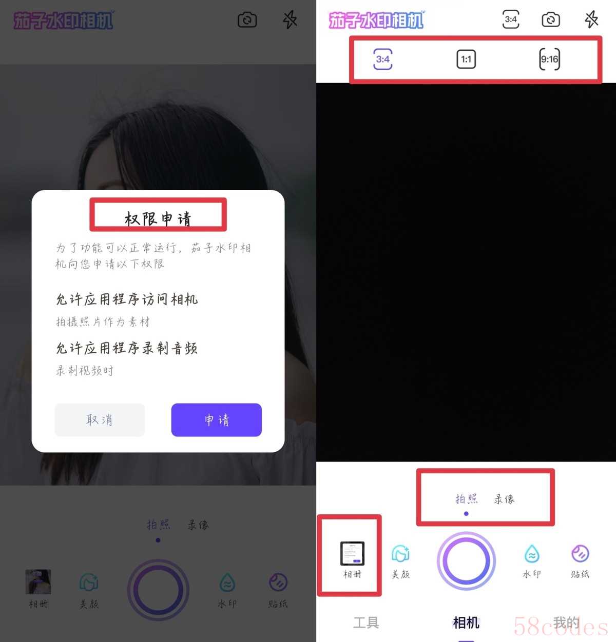 开启相关权限即可进入照片和视频拍摄模式,也支持从手机相册导入已有的照片或视频进行相应处理,内置3种尺寸比例,可根据自身的需求偏好来选择。