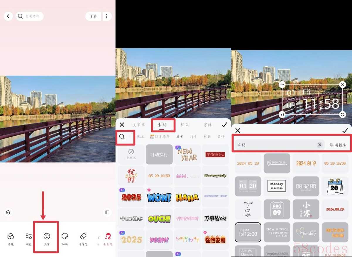 在跳转界面点击“素材”选择“搜索”,然后打字输入“时间水印”,喜欢的选中即可套用,还支持编辑修改文本内容、样式、字体等参数,最后保存就完成了。