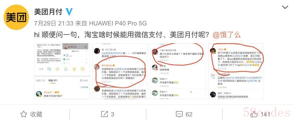 对此,美团月付再发微博做出回击:“hi,顺便问一句,淘宝啥时候能用微信支付、美团月付呢?”