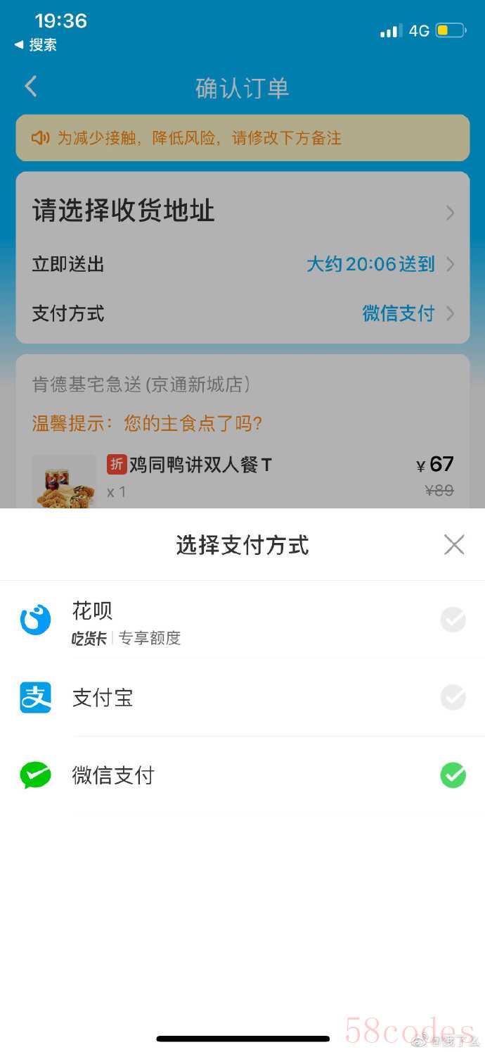 饿了么微博发出的订单结算页面显示,微信支付位列其中