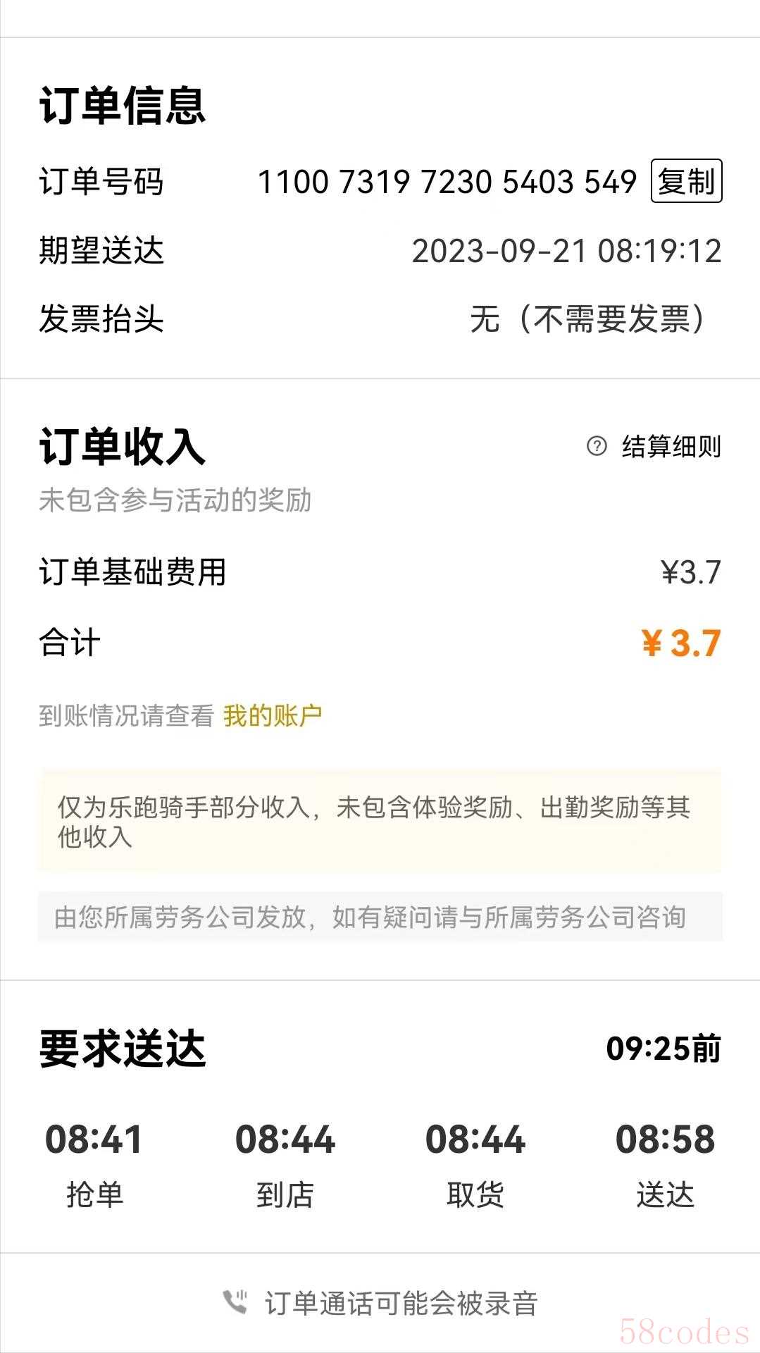 9月21日08:41 我接到去某酒店的订单,送1个沐浴露,价值36.5元,配送费3.7元