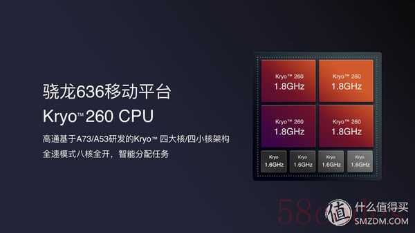 没想到忽然冒出了一颗骁龙636。4大核+4小核架构,最高1.8GHz,GPU是Adreno 509。俨然就是骁龙660的缩水版。