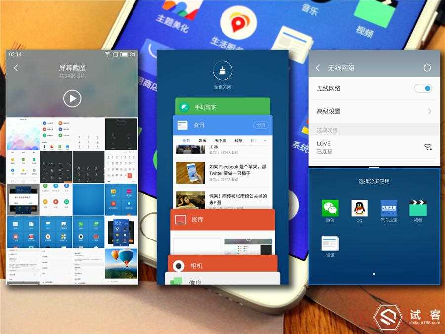 图库也在Flyme 5.1系统中做了更改,在每个图库相册中,会根据文件类型进行分类,在图片的相册中,点击上端的播放按钮米就可以播放幻灯片,视频的文件中,就可以播放视频,非常实用。后台的清理界面也做了更改,全新的Flyme 5.1改为了卡片式结构,所有后台应用会以卡片形式展现,左右滑动应用卡片即可清除应用的运行,这种设计更加符合Android的设计标准,同时扁平化的风格也更加简约大方。除此之外,打开卡片多任务后点击右上角的按钮可以开启分屏功能,可以一边看剧一边聊微信,还是非常方便的。
