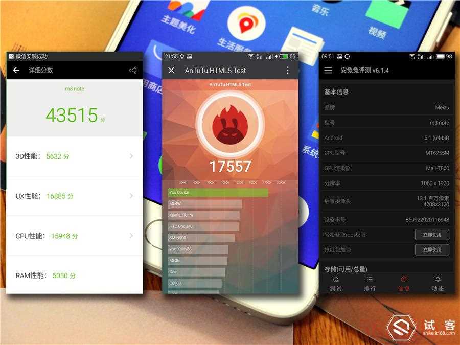 使用安兔兔软件测试中,魅蓝 note3跑出了43515的分数,排行中占据了中游位置。从测试结果来看,要比上一代的MT6752/骁龙615要强,担心和性能提升明显。GPU方面则为Mali-T860mp2,主频为700MHz ,在跑分3D测试中也取得了5632的分值。一般主流游戏都能流畅运行,日常使用足够了。