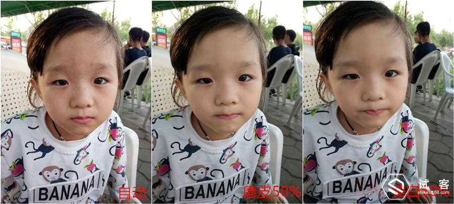 家中萌宝还是很配合的,通过在 自动,磨皮50%和美白50%的模式下,拍摄样张进行对比。自动模式下相比磨皮和美白,效果相对差一些,而磨皮和美白效果相差甚微,并不明显。但是都对皮肤做了很好的美化效果,综合表现不错。