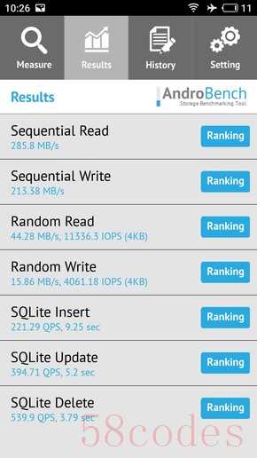 在AndroBench存储测试中,魅族15顺序读取速度可达285.8MB/s,顺序写入速度可达213.38MB/s,与同价位众多热门手机持平。