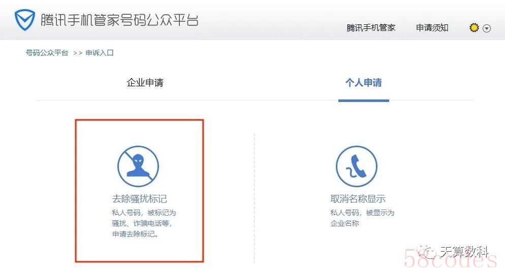 第2步:选择个人申请下的“去除骚扰标记”,点击进入下一步。